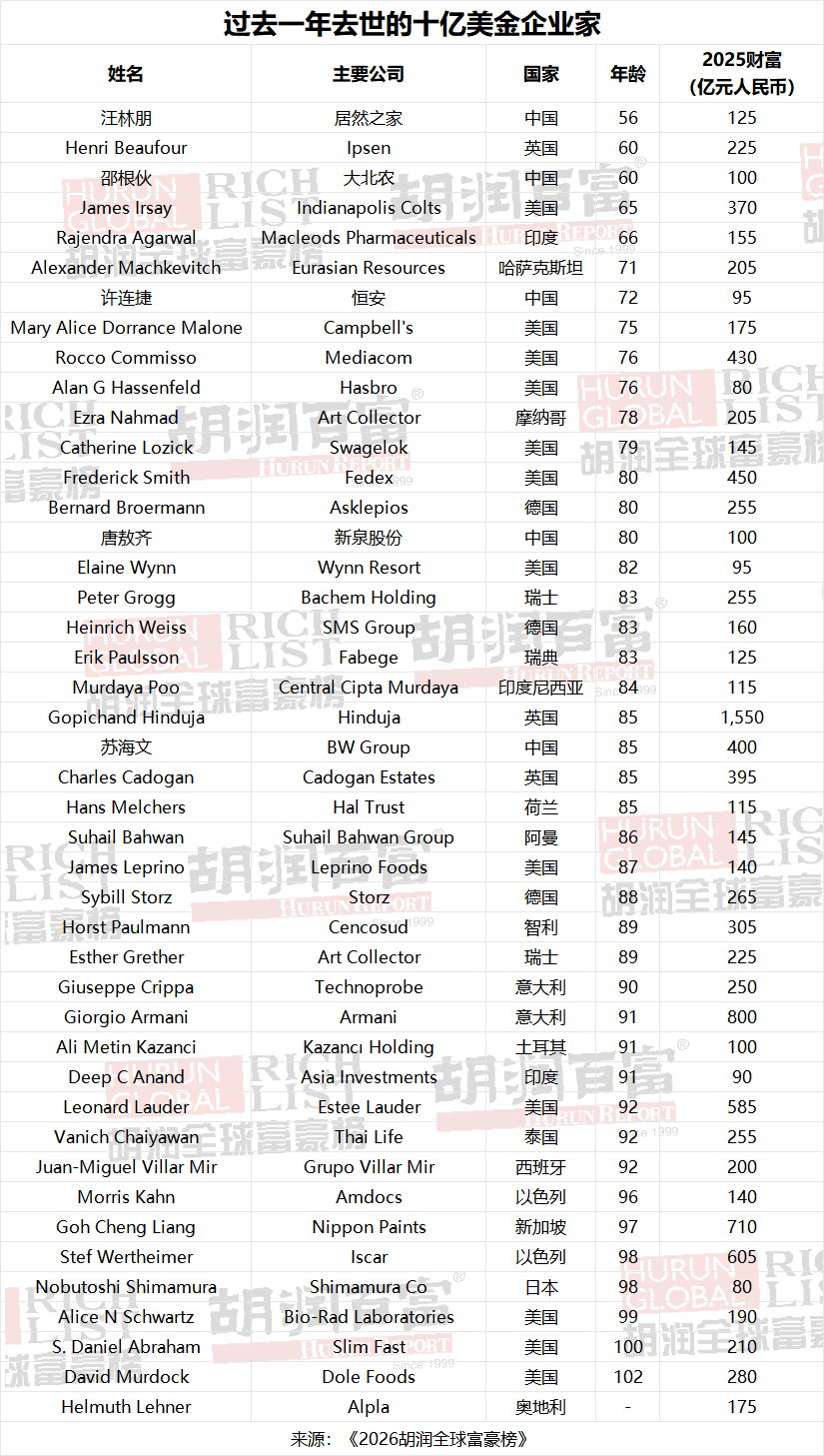 、60岁的大败农的邵根伙、60岁的Ipsen的Henri Beaufour和65岁的印第安纳波利斯小骑兵的老板James Irsay。14人春秋正在90岁或以上,此中美都城乐食物的David Murdock(客岁财富280亿元人平易近币)和Slim-Fast的S。 Daniel Abraham(客岁财富210亿元人平易近币)跨越百岁。他们总共将1。2万亿元人平易近币的财富传给了家庭。